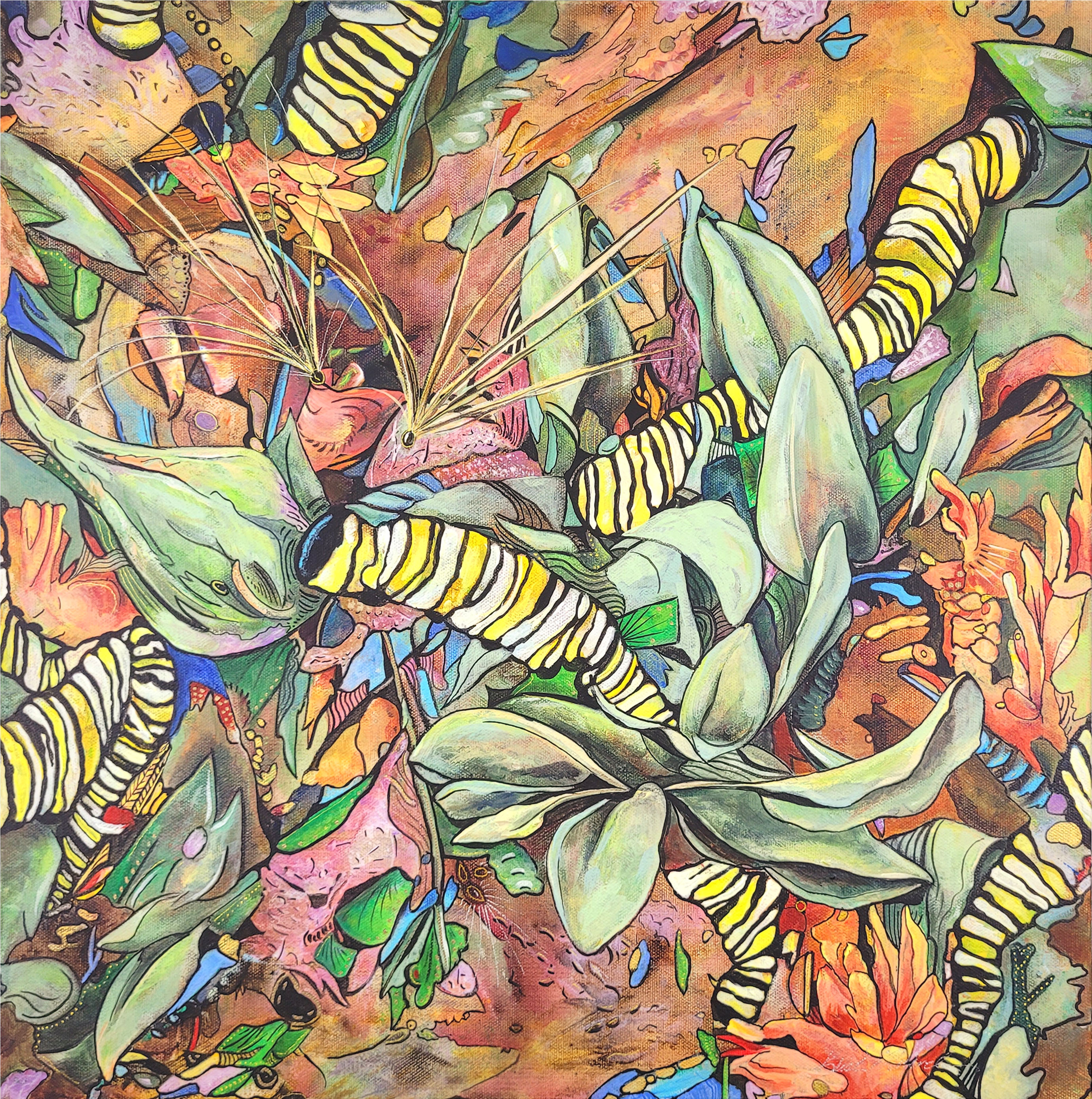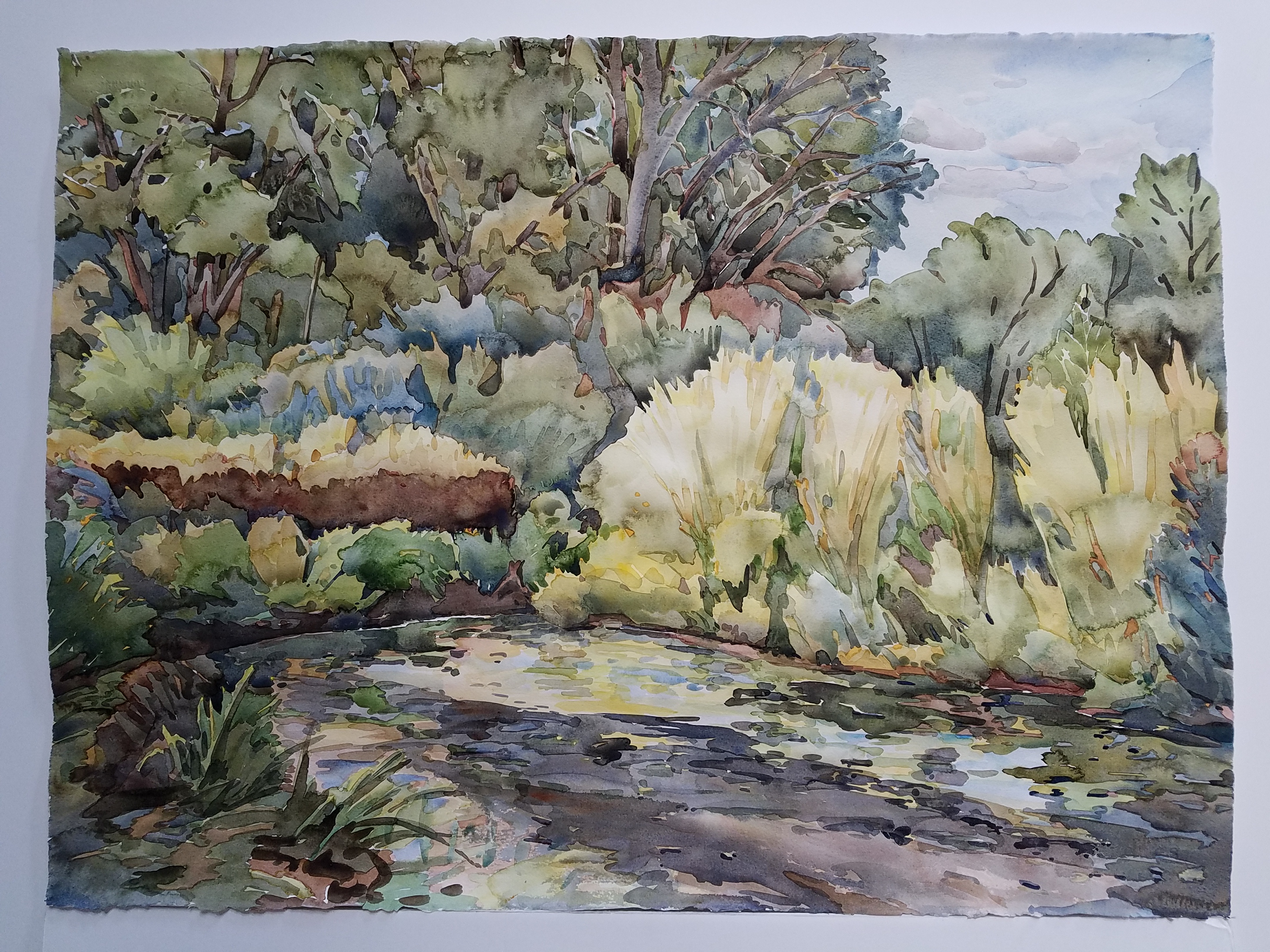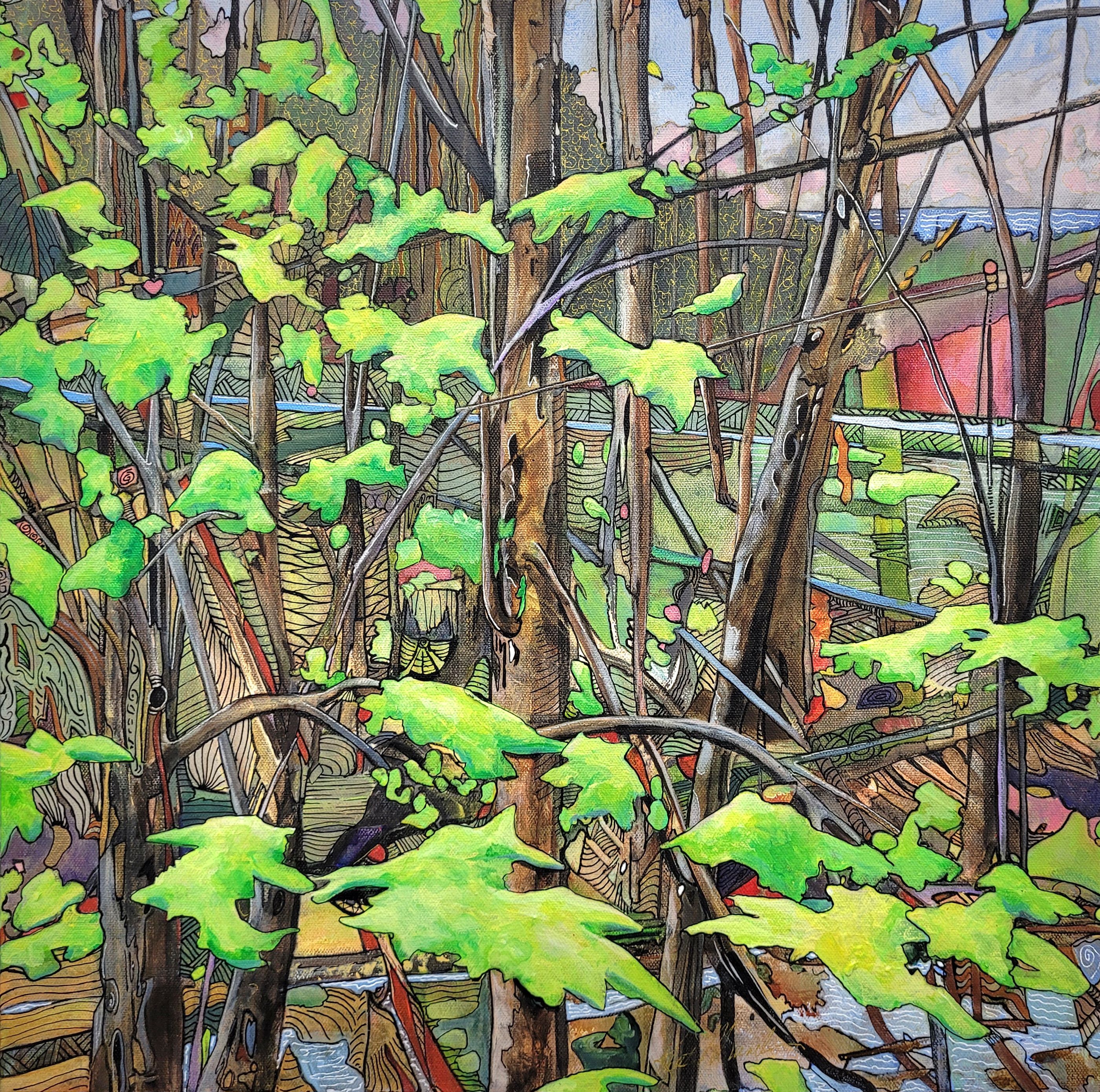 This most recent body of work connects the spontaneity of plein air watercolors to a deliberate expressionist construct that encourages viewing at both a comprehensive and intimate level; glimmering as the viewer shifts position. I use a language of mark-making and patterns to interpret the enigmas of our frenzied modern culture and our yearning for deep connection to our precious natural environment. It is the allure of nature’s beauty, intermingling with contemporary distracted life and the frolic of my mind, which guides my expressionism.